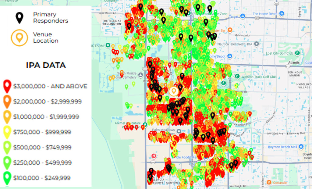 By mapping IPA (Income-Producing Assets) data tied to your seminar invites, you can visually see where registrants are located around each event and achieve a helicopter view of the IPA ranges represented.
